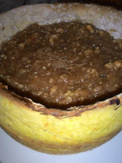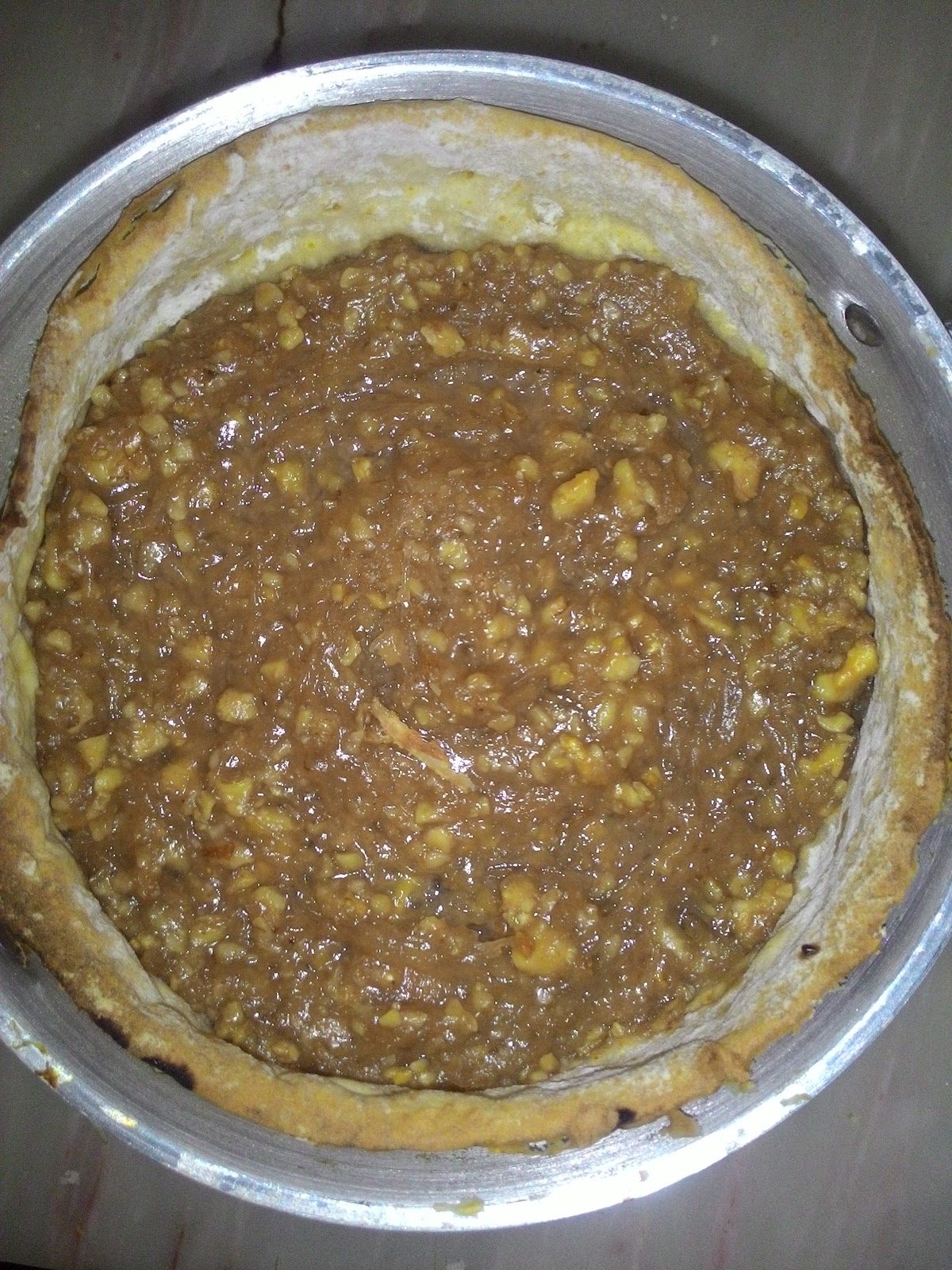 O recheei não é novidade nenhuma, usei doce de ovos (200 grs) que tinha mandado vir da Doce Magia, já agora há muito tempo que não comia um doce de ovos tão bom sendo de compra, um frasco de doce de gila (cerca de 200 grs) que tinha feito, caseiro com a última abóbora de gila que a Maria Lopes, deste mesmo blog me ofereceu, e nozes picadas (cerca de 180 grs)