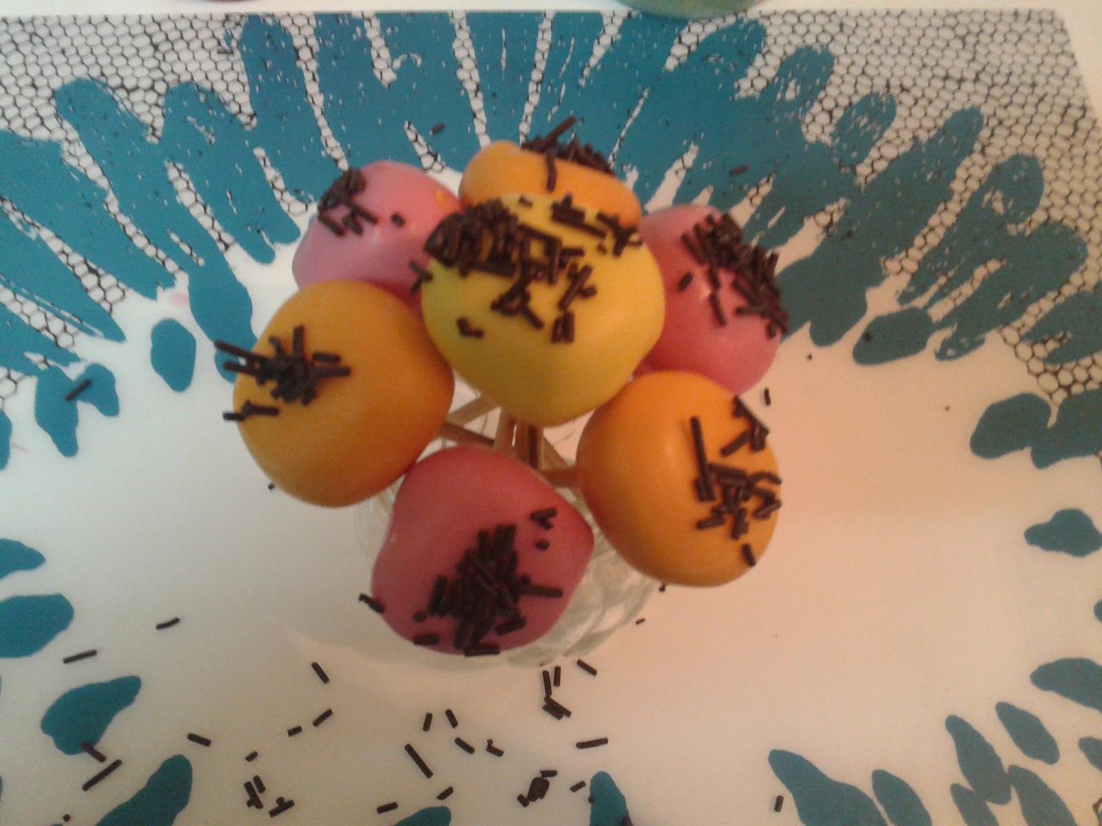 Como não fiz em todos... (claro colocar merengue á mão dá mesmo muito trabalho e fica horroroso) os que sobraram fiz com chocolate de laranja, limao e morango com algumas missangas de chocolate.