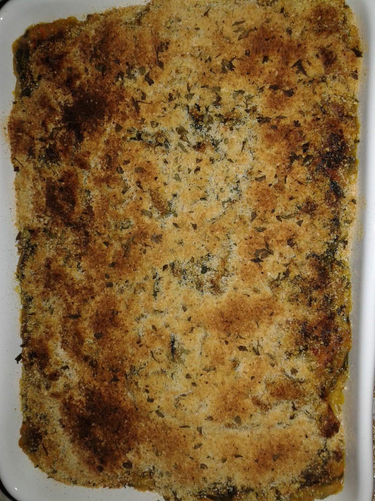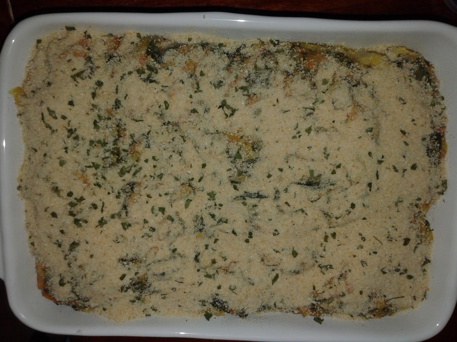 Assim que terminar os legumes juntar o bacalhau e o molho bechamel. Colocar num tabuleiro e polvilhar com pão ralado com salsa.