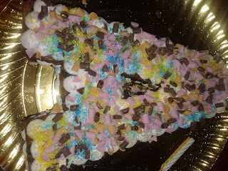 Nesta ultima eu não queria flores por isso usei aparas de chocolate rosa de morango, castanho claro de caramelo, castanho escuro de leite e alguns bocadinhos de açúcar azul e amarelo.