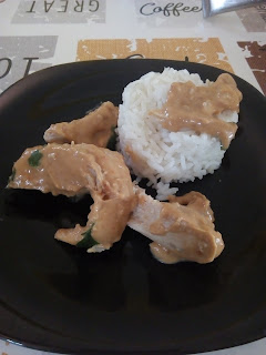 Retirar a carne e deitar o molho de manteiga de amendoim, deixar ferver um pouco na função guisar, temperatura máxima 3 minutos, mexer para não agarrar, até ficar espesso.