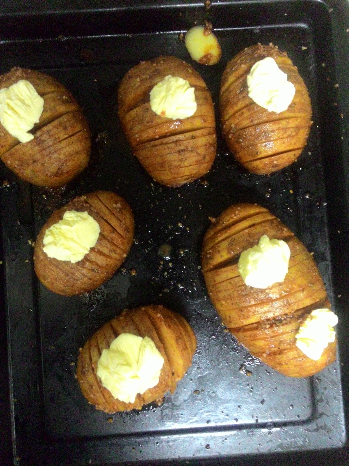 Colocar as batatas num tabuleiro, com um pincel, pincelar generosamente as batatas tentando chegar a todas as tiras, colocar uma noz de manteiga em cima de cada uma delas, levar ao forno até estarem macias, demorou cerca de 30 a 40 minutos.