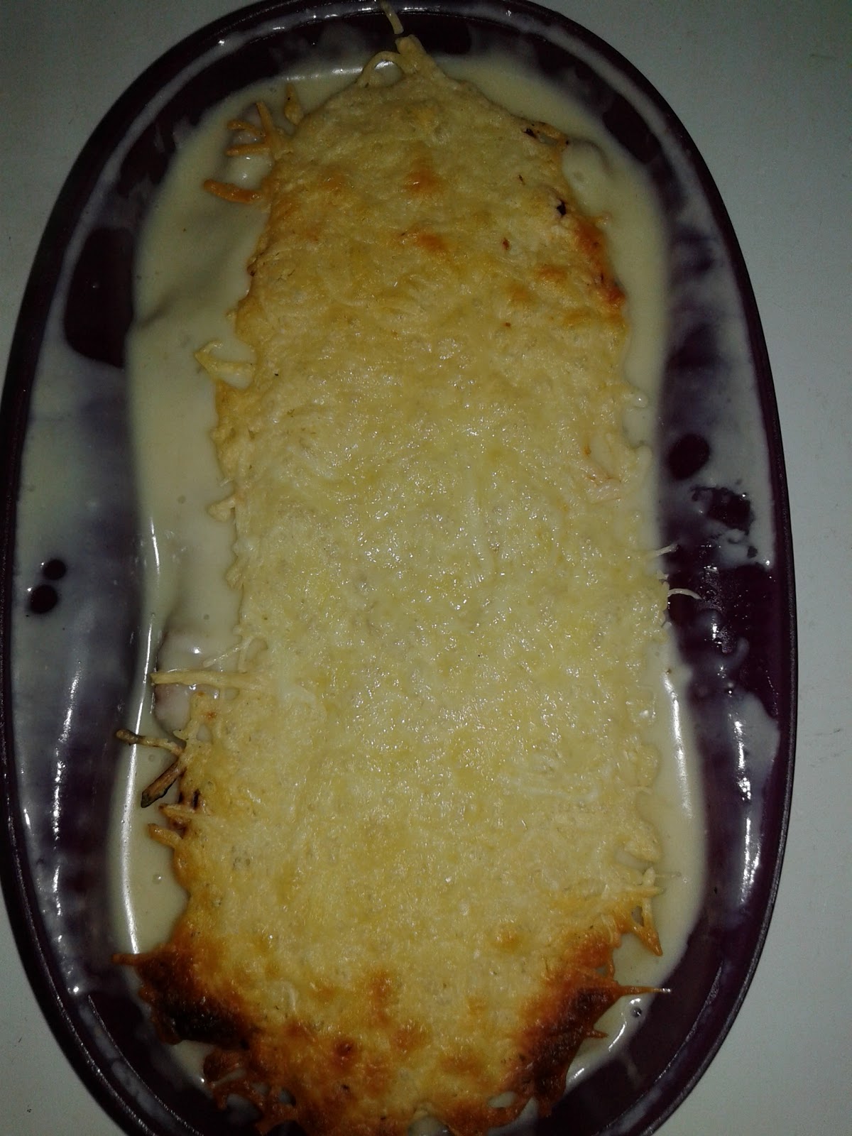 A parte fiz o molho bechamel, coloquei margarina derreteu, coloquei farinha e fui colocando leite aos poucos até achar a consistência que gostamos nem muito liquido nem muito grosso, temperei com sal, pimenta, noz moscada, sumo de limão e mostarda.