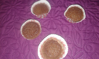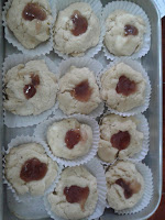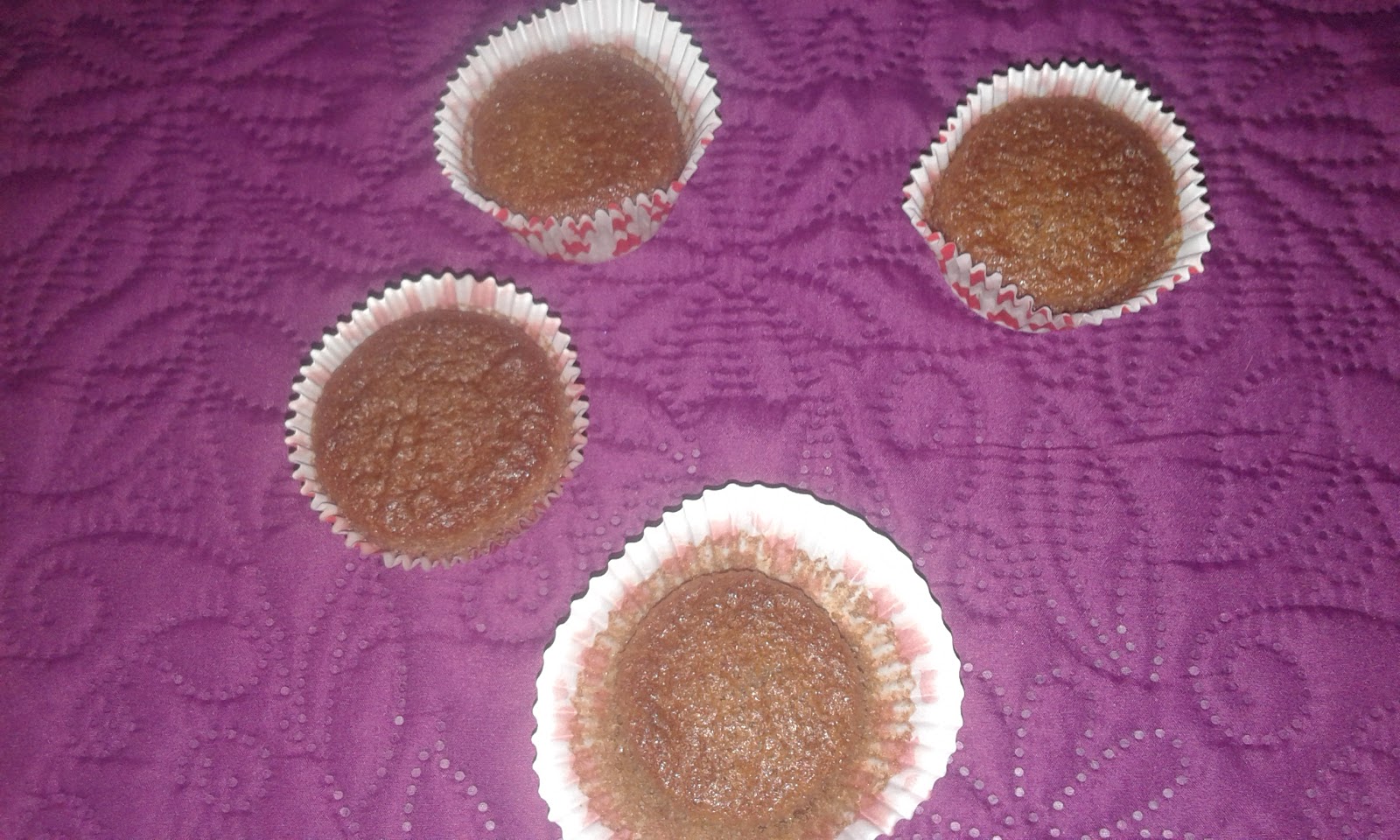 Colocar uma ou duas colheres de sopa da massa nas formas, e em cima com o dedo fazer uma ligeira cova para colocar uma colher de sobremesa de doce ou compota o que preferirem, eu usei doce de pêssego rosa que tinha feito, ou seja caseiro.