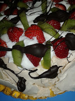 Depois de frio a ideia era cortar ao meio e colocar o chantily depois a fruta em cima e a parte de cima, o que fiz foi num bolo coloquei o chantily e a fruta e em cima coloquei o outro.