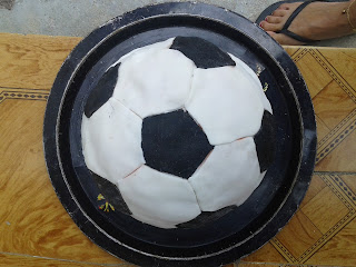 Fiz o bolo em casa e transportei para a terra onde fiz o acabamento do recheio e da cobertura, não foi nada dificl ao contrario do que pensava, também tive a ajuda do meu filho mais velho que estendeu a pasta de açúcar e cortou as partes pentagonais.
