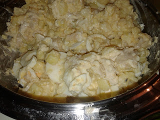 Coloquei a descongelar de manhã, quando cheguei a casa toda contente abri o saco e.... era tipo filetes super finos e quadrados (como se fossem pedaços para o arroz), fui ler a etiqueta e... Bochechas de Tamboril, ora bola isto para o arroz não vai dar, encolhe demais e são poucas, decidi experimentar desta vez a receita de fricassé da Ana Rama, diferente do que tinha feito.